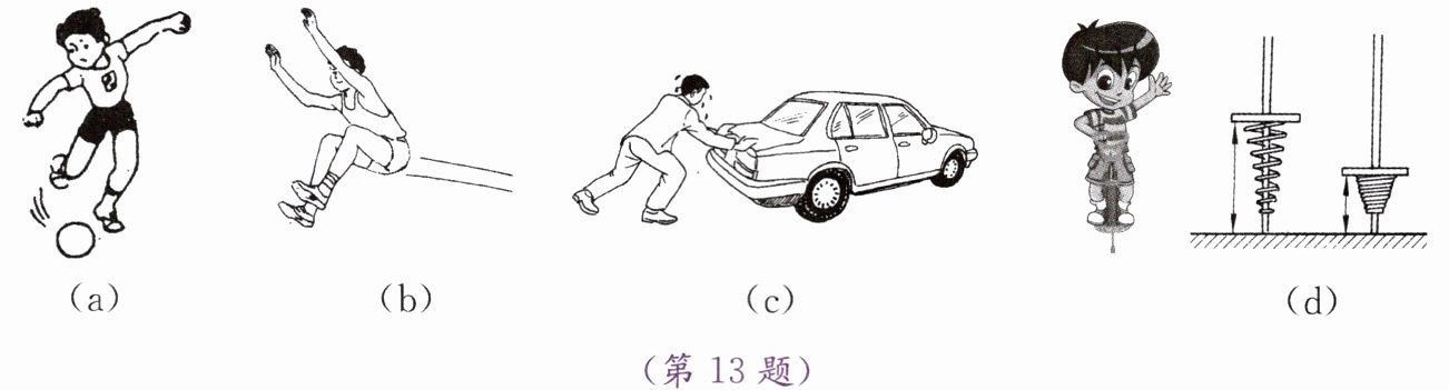 D.图(d)中,玩具蹦蹦杆跃到最高点时,男孩的速度为零,男孩所受的力相互平衡