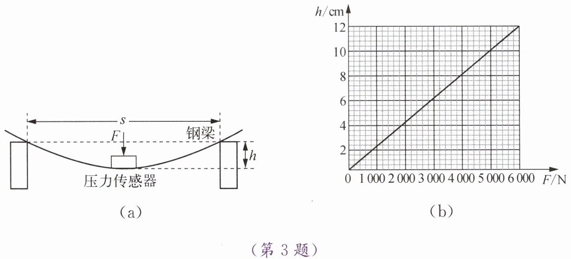 3. 我国是桥梁建设大国,桥梁建设技术处于世界领先水平。如图(a)所示,钢梁受力后发生弯曲变形时,横截面的中心在垂直于轴线方向上移动的距离h称为挠度,表示钢梁弯曲的程度,它在建设桥梁过程中非常重要。小明通过分析桥梁结构作出以下猜想:① 挠度h可能与钢梁受到的压力F有关;② 挠度h可能与两个支撑柱的间距s有关。为了验证猜想,他进行了如下实验: