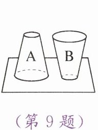 9. 如图所示,两个形状、大小、材料完全相同的圆台形实心物体A和B放在水平桌面上。A对桌面的压力为F₁,压强为p₁;B对桌面的压力为F₂,压强为p₂,则F₁