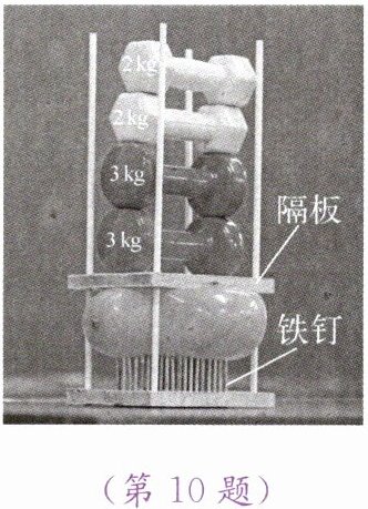 10. 把气球压在一根铁钉的钉尖上,稍一用力,气球就会被刺破;但在如图所示的实验中,将气球放在钉板的钉尖上,然后在气球上方的活动隔板上放置几个哑铃。我们看到气球发生了