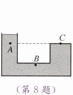 8. 如图所示的容器中盛满水,则水对A、B、C三点的压强的大小关系为(