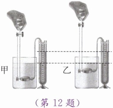 12. 小明将同一压强计的橡皮膜盒先后放入甲、乙两种液体中,观察到的现象如图所示,则这两种液体的密度大小关系是(
