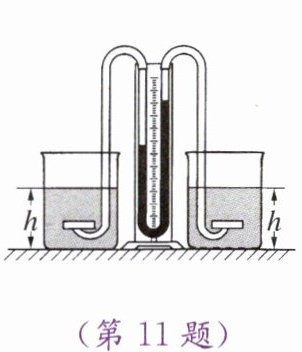11. 如图所示,用压强计研究液体内部压强,若左、右两烧杯中的液体对压强计橡皮膜盒上橡皮膜的压强分别为p₁、p₂,则由图可知,它们的大小关系是p₁