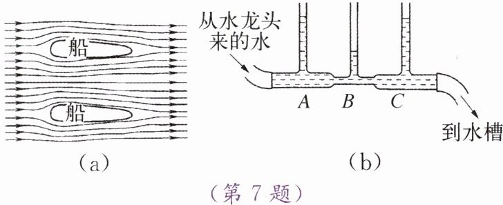 8. 如图所示,在一个盛水的玻璃杯内插入一根吸管A,用另一根吸管B对着A的管口吹气,看到A的管口有水喷出。这是因为流体的流速越