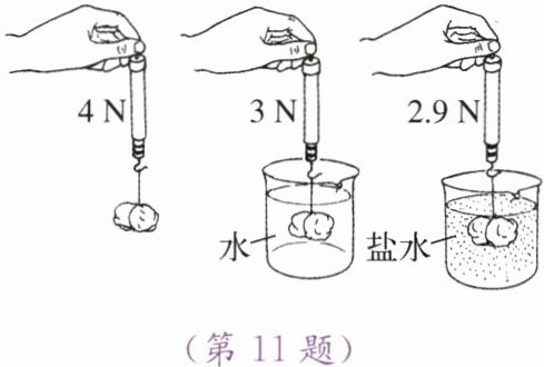 11. 在课外小组活动中,小刚将挂在弹簧测力计下的形状不规则的石块分别浸没在水和盐水中,弹簧测力计的示数如图所示,石块在水中所受的浮力为