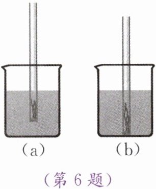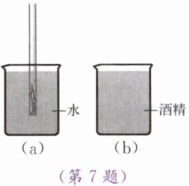 7. 小明发现一个简易密度计在水中的位置如图(a)所示,请在图(b)中画出它在酒精中的大致位置。
