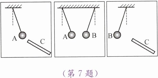 7. A、B是两个轻质泡沫小球,C是用毛皮摩擦过的橡胶棒,A、B、C三者之间相互作用时的场景如图所示,由此可以判断(