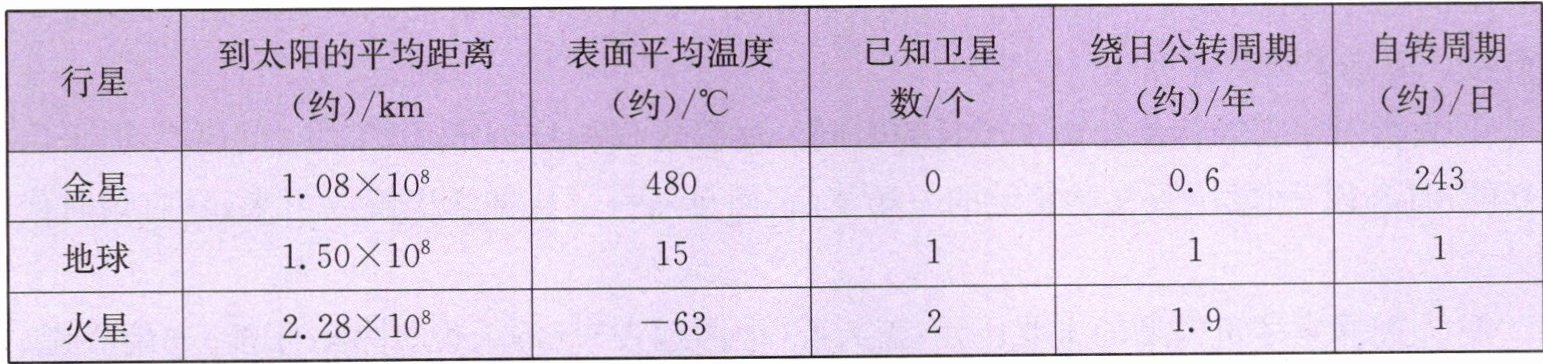 (1)分析表中数据,金星到太阳距离1.08×10⁸km,表面温度480℃;地球距离1.50×10⁸km,温度15℃;火星距离2.28×10⁸km,温度-63℃。距离太阳越远,表面平均温度越低。