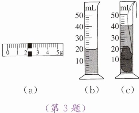3. 在用托盘天平和量筒测量矿石密度的实验中,被测矿石放在天平的左盘,在右盘中加砝码并移动游码。天平平衡时,右盘内有20 g的砝码两个,10 g的砝码一个,游码位置如图(a)所示,则矿石的质量是