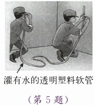 5. 如图所示,在装修房屋时,工人师傅常用一根灌有水(水中无气泡)、两端开口且足够长的透明塑料软管的两端靠在墙面的不同地方,并在两端的液面处均做出标记。这两处标记