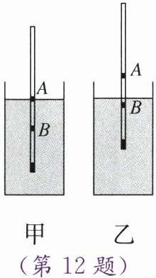 12. 如图所示,小明取一根塑料吸管,下端塞入配重(如铁丝、铁屑等),并密封起来做成一个简易密度计,然后将这个自制的简易密度计分别放入甲、乙两种不同液体中。下列判断正确的是(