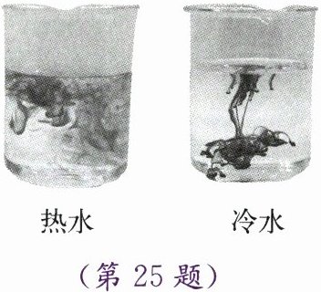 答案:25. (1) 墨水在热水中扩散得较快 温度越高,分子热运动越剧烈 (2) 水和酒精的温度相同;墨水同时滴入两只烧杯中,等等