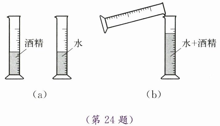 24. 如图所示,在 50 mL 水中注入 50 mL 酒精,充分混合后发现总体积比 100 mL