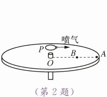 2. 如图所示,转轴在转盘中心 $ O $ 处,气球固定在转盘上 $ P $ 处,松开气嘴,让气球沿垂直于 $ OP $ 方向喷气,由于力的作用是
