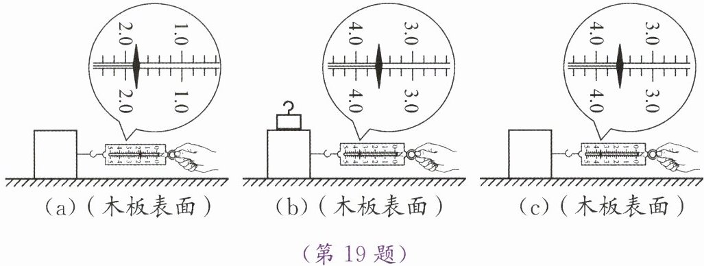 19. 如图所示是探究影响滑动摩擦力大小因素的实验装置,三次实验中木块都在材质相同的木板上做匀速直线运动,其中,图(a)、(b)所示的两次实验中木板的粗糙程度相同,图(c)所示的实验中木板的粗糙程度更大一些。