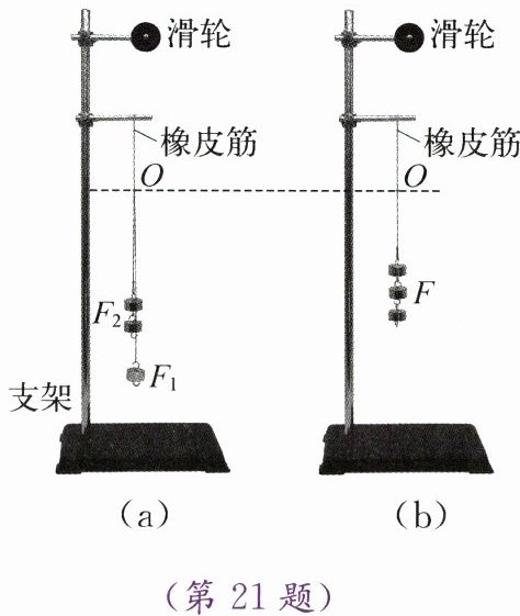 21. 如图所示是小明在探究同一直线上的两个力的合成实验中出现的情景,请根据该情景回答下列各题: