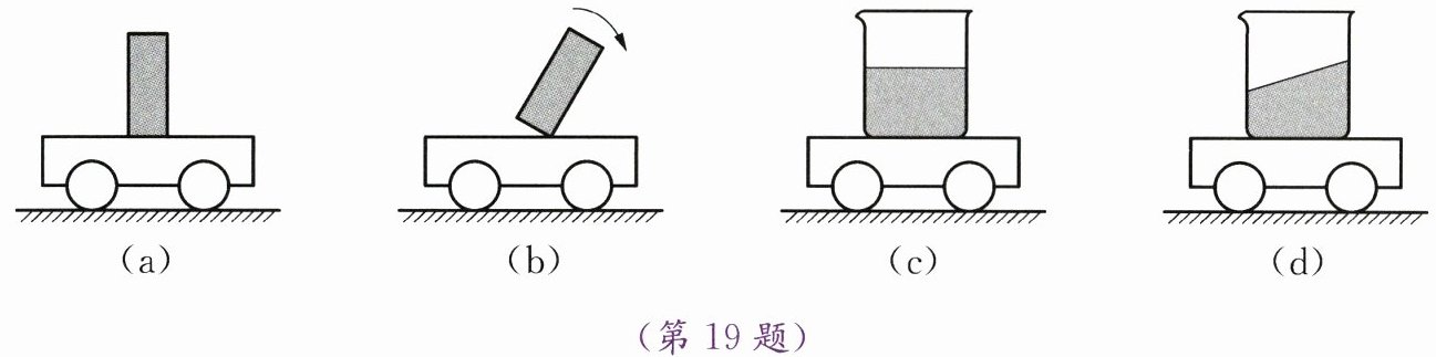 19. 如图所示,(a)、(b)、(c)、(d)四幅图中,木块和盛有水的烧杯放在小车上沿水平方向一起向右运动,图