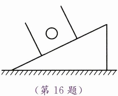 16. 如图所示,一烧杯静止在斜面上,杯中盛有半杯水,水面上漂浮着一个空心铁球,试在图中画出杯中水面的位置及小球的受力示意图。