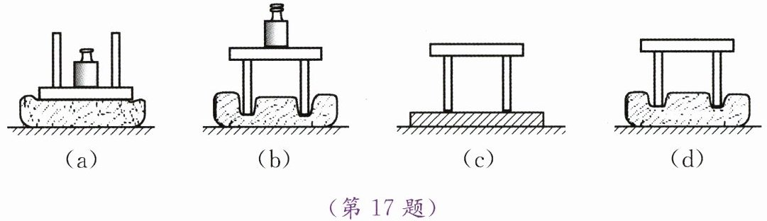答案:17. (1)压力一定时,受力面积越小,压力的作用效果越明显 (2)受压物体的材料不同 (3)压力大小 受力面积一定时,压力越大,压力的作用效果越明显