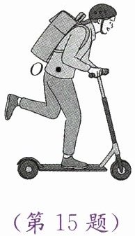 15. 如图所示,小明的重心在 $ O $ 点,请画出小明所受的重力和他的脚对滑板压力的示意图。