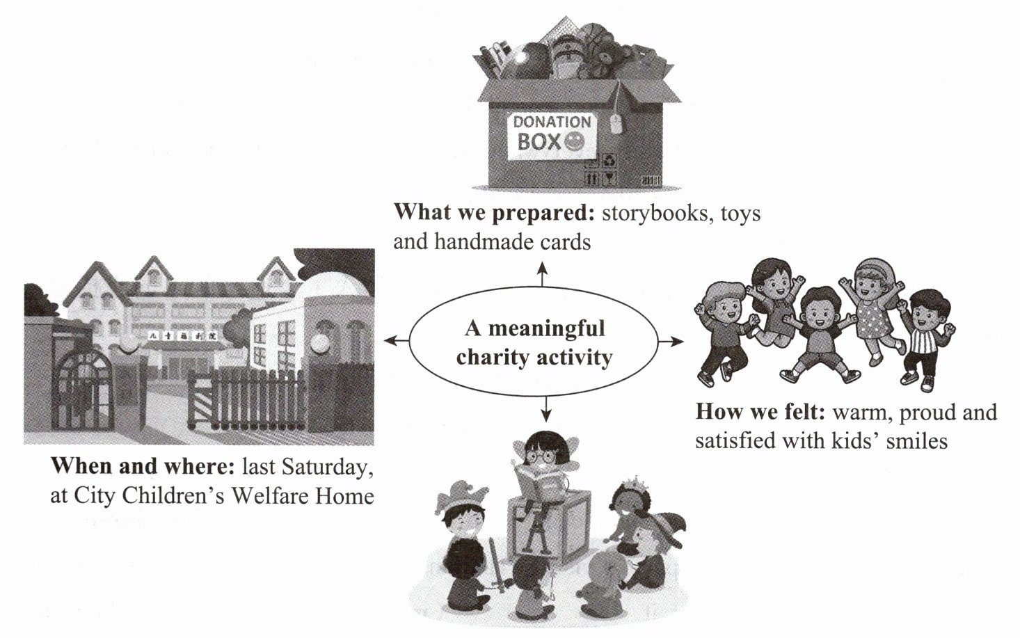 答案:Last Saturday, my classmates and I took part in a meaningful charity activity at City Children's Welfare Home. We prepared many things, such as storybooks, toys and handmade cards. When we arrived there, we gave these gifts to the children. Then we read stories for them and played games together. Seeing the children's happy smiles, we all felt warm, proud and satisfied. It was a great experience, and I hope we can do more such activities to help others.