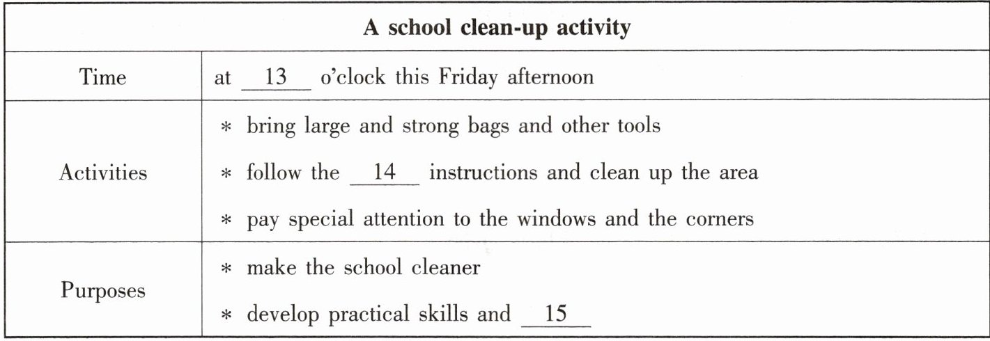 听第一篇短文,回答第 13 至 15 小题。请根据短文内容,选择正确答案,完成信息记录表。