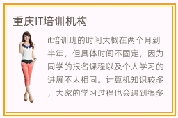 it培训班的时间大概在两个月到半年,但具体时间不固定,因为同学的报名课程以及个人学习的进展不太相同。计算机知识较多,大家的学习过程也会遇到很多难题,要是报名辅导机构,便可以深入了解这些知识,也能达到比较高的水平,竞争力也会更强一点。但不管选择什么样的院校类型,还是要结合自己的实际情况,兴趣爱好,努力的程度,达到更好的效果,有些院校可能有更多学习和动手的机会,学习的速度可能会加快,效果也会更加理想。倘若技术员朋友们想在专业领域的突破更多,可以联系一下重庆it培训电话,关注it教学效果怎样,找到合适的项目。计算机专业的课程非常重要,很多同学只关注一些浅层的理论,并不太懂得基本的应用方法,导致工作的水平达不到标准,有可能会被淘汰。