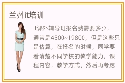 it课外辅导班报名费需要多少,通常是4500~19800,但是这些只是估算,在报名的时候,同学要看清楚不同学校的教学能力,课程内容,教学方式,然后再考虑费用问题。兰州IT培训机构哪家得专业讲授比较好呢。计算机专业的丰富多样也造成了就业方向的多样性,不同的计算机专业会有相对应的职业。要想学好计算机IT专业技术就需要进入靠谱的计算机培训机构进行专业学习,因此国内各地都开始先后开设了很多家专业的IT培训机构。但是在学习期间,还要听老师安排,完成重要的项目,不断达到更高的水平。兰州IT培训学校具有先辈的讲授理念,在培训学生的计算机专业才能的同时,一直对峙以就业为本的准绳,踊跃展开各类校表里的活动,并胀励学生介入此中。