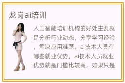 人工智能培训机构的好处主要就是分析行业动态,分享学习经验,解决应用难题。ai技术人员有哪些就业优势,ai技术人员就业优势就是门槛比较高,如果只是刚刚起步,不懂得怎么应用,确实很难完成工作项目,也难以找到工作。不少学生感觉人工智能太复杂,超过自身理解能力范围,所以会考虑龙岗人工智能培训班。人工智能培训班的师资相当强,不少学生在老师的指导下,都能获得很好的业绩,也能赢得更大的发展舞台。人工智能要学习多长时间,可能要学一个月到三个月,要看个人的学习方法。若水平还不是特别强,无法自学,可以报名专业机构。ai教育机构网络课程有没有帮助,多数机构的网络课程都非常实用,老师在网络平台上跟同学交流,可以分析同学的弱点,找到需要弥补的领域,进一步拓宽学习范围。