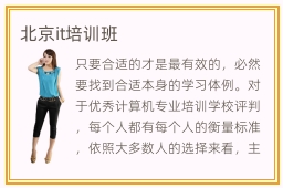 只要合适的才是最有效的,必然要找到合适本身的学习体例。对于优秀计算机专业培训学校评判,每个人都有每个人的衡量标准,依照大多数人的选择来看,主要是以以下几个方面来判定的。培育更多计算机专业技术人材,在各地都开设受权分校区,是北京IT培训学校的终究斗争眼标。主要为实现青年一代的IT梦提供一个崭新的平台。计算机相干专业包括了良多,比方JAVA语言编程设计、web网站前端设计以及软件开发设计专业等都是计算机浩繁专业中的一种,北京IT培训学校便是一以是计算机专业讲授培训为重点的学校,开设了各类百般的计算机专业课程。北京IT培训学校是一所以计算机相关专业课程教学为主的学校,为不同计算机相关专业的不同就业方向设定了不同的培训课程。