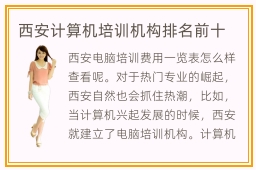 西安电脑培训费用一览表怎么样查看呢。对于热门专业的崛起,西安自然也会抓住热潮,比如,当计算机兴起发展的时候,西安就建立了电脑培训机构。计算机相关专业的学习是一段漫长、枯燥的学习过程,每年都存在一些因为坚持不下去而半途而废的计算机专业学生。计算机相关专业的学习过程是漫长而又枯燥的,想要学好计算机相关专业也并不是一件容易的事情,每年都有很多人因为计算机相关专业的学习艰难而放弃,在我看来这都是很可惜的。所以想要学到专业的电脑技术就到西安计算机培训机构进行系统培训学习。适合新手学习嘛。从两方面来说,参与这些实践项目的活动可以充分了解计算机相关专业在就业中的价值体现,也能从中获得很多宝贵的实践操作经验。