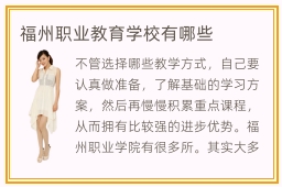 不管选择哪些教学方式,自己要认真做准备,了解基础的学习方案,然后再慢慢积累重点课程,从而拥有比较强的进步优势。福州职业学院有很多所。其实大多数人只要找专业的学校有相应的规模,老师的水平比较高,通过自己的培养,一段时间后,相信会有很大的收获。是福州市重点职业技术学校。另外很多学校都要都是非常负责任的,而且老师的水平相对来说都比较高,而且都有高学历,在实践的岗位上工作多年,所以说也可以值得大家的选择。职业学院就业形势目前来说还是相当不错的,因此很多学生会选择职业学院作为他们的第一志愿。福州职业学院是一所多种技能融合型的职业学院。其实学校有很多,而且质量参差不齐,也不是所有职业学校都有效果,每个学校都有不同的教学模式和教学质量,学生毕业之后的水平也存在很大的差异。