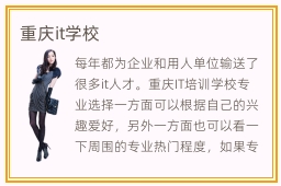 每年都为企业和用人单位输送了很多it人才。重庆IT培训学校专业选择一方面可以根据自己的兴趣爱好,另外一方面也可以看一下周围的专业热门程度,如果专业比较热门,那么就业可能会比较简单,但竞争压力会更大。重庆it培训it培训班有很完善的课程,将计算机专业的训练分为多个阶段,包括基础培训阶段、应用训练阶段以及思维训练阶段。而辅导班会将高效率的it应用课程展示给学生,学生学习完这些课程后,更快理解it工作要求,在学校就能熟练掌握工作要求和专业技能,在岗位上发挥出比较高的应用水准,从而获得更多竞争优势。刚开始学习计算机专业领域的内容,大家可能会发现某些技术确实比较难,要求也比较多,如果没有老师指点,要花很多时间学习。