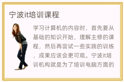 学习计算机的内容时,首先要从基础的知识开始,理解主修的课程,然后再尝试一些实践的训练,成果应该会更可观。宁波it培训机构就是为了培训电脑方面的人才而建立宁波it培训机构培训经验的。宁波IT培训机构由于近几年不断发展的计算机行业而得到了飞速地发展,现在的投资者不但注重学校的教育水准,更注重口碑评价和学校的专业项目研究,这样一来,国内的计算机IT培训机构就在教学质量上得到了一个崭新的突破,开始追求教学成果。比较好的宁波IT培训机构有哪些。it教学机构师资力量如何,往往会比较突出,首先老师会结合不同学习阶段和不同需求的同学,带来许多相关的课程。在学习计算机时,很多同学只停留在简单的课程内容,没有认真学习高难度的知识点,竞争中处于被动。