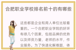 这些都是企业和用人单位比较看重的。一个合肥职业学院的好坏有很几个因素,包括品牌的优势以及师资力量,老师的水平,作业服务。为了快速化解难题,体现出优势,学生要积极做准备,努力积累更多知识,提高学习的进程,改善学习效率,应用成绩会有比较大的突破。合肥职业学院还是有好多所的,它们都是专门培养人才的学校,合肥这个城市是很让人人向往的,在这里读书一定很轻松愉悦,相对比其他学校要好得多。要解应这个成绩,首先我们要晓得21世纪,这事一个信息大爆炸的时代,在这个时代我们习气了电脑给我们供应的各类便当,停止2011年6月尾,中国网平易近规模到达4。职业学院也许不是大多数学生的第一选择,但对一些考试时转折点没有把握好的学生,也许是唯一的选择,因此在选择这些学校的时候要多做对比,了解学员的学习成果,就业的情况以及入学门槛,找到适当的学校,提升自己的专业技能。