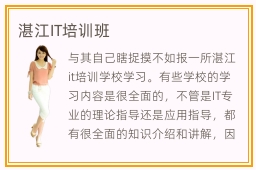 与其自己瞎捉摸不如报一所湛江it培训学校学习。有些学校的学习内容是很全面的,不管是IT专业的理论指导还是应用指导,都有很全面的知识介绍和讲解,因此可以发挥理想的技术培训价值。由于it行业的迅猛发展,导致了it行业的市场潜力也是巨大的。但是选择这些机构,往往也有很多参考因素,其中一种就是湛江it培训价格。it培训课程多吗,IT培训课程很丰富,主要就是围绕各种难题进行分析,帮助学生优化课程体系,分析计算机专业的发展趋势。一些同学虽然很重视计算机专业领域的知识,但不知道如何学习,也不知道哪些课程对将来的应用有帮助,遇到问题时也非常困惑。如果是比较高级的阶段,需要掌握实践技巧,结合平时所学的内容,完成各种实践项目。