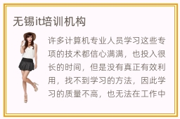许多计算机专业人员学习这些专项的技术都信心满满,也投入很长的时间,但是没有真正有效利用,找不到学习的方法,因此学习的质量不高,也无法在工作中体现作用。it的就业方向非常丰富,计算机专业的学生可以从事非常多项工作,比如软件开发工程师、计算机操作系统工程师、程序员等等。IT培训能不能够零经验学习,当然可以从零开始,其实大多数学员都是经验和技术不成熟,所以才会选择培训班的学习。有越来越多的人想要学习计算机技术的,都选择到无锡it培训it培训学校里面学习。IT培训有没有简单课程,当然也会有比较多简单课程,但这些课程的内容也需要大家花时间去掌握,而不是随便学习。比较热门的it培训班的教学方法有远程网络指导、实践应用指导、入门级的指导等等,因为很多同学都没有太清晰的思路,经验也非常有限,培训效率会低很多。