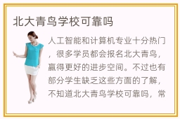 人工智能和计算机专业十分热门,很多学员都会报名北大青鸟,赢得更好的进步空间。不过也有部分学生缺乏这些方面的了解,不知道北大青鸟学校可靠吗,常常在选择时十分困惑。北大青鸟学校优势主要就是师资力量相当雄厚,课程设置也很科学,假如自己的能力不强或者是优势不明显,竞争水平会比较糟糕。但是报名辅导班后,会将更多工作岗位的技能传授给学生,学生很快就能够转化成自己的能力。北大青鸟学校小班辅导对学生的知识应用非常重要,假如说学生在小班教学的帮助下,老师会时刻了解学生的需要以及学习进度,如果和存在任何疑难问题,都可以马上反馈,老师会进行针对性的辅导,将各种问题解决掉。学生经过一系列的辅导之后,有助于开拓自己的思维,掌握一些思考方式,以后学习的速度可以加快。