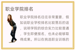 职业学院排名往往非常重要,假如说职业学校排名比较落后的话,说明学院的综合实力比较普通,学生即便报名,也未必能够取得成果。所以在挑选职业训练的时候,应该看清楚每位老师的专业实力,再找到比较好的课程,成绩就会变得更好。职业学院老师通常都会有很多年的社会历练,了解职场的需要以及各种工作岗位的技能,将这些技能充分展示给大家。职业学院哪些好,选择职业学院,要考虑几个重要的指标,包括学习的方法、教学的目标和任务、教学类型等等。有些职业学院确实非常不错,教学任务非常明确,内容也非常多,大家也感到很满意。另外,也有一些职业学院的教学速度比较慢,学习方式不够多,课程不够严谨,学生理解起来也十分艰难,所以收获会很少。