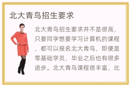 北大青鸟招生要求并不是很高,只要同学想要学习计算机的课程,都可以报名北大青鸟,即便是零基础学员,毕业之后也有很多进步。北大青鸟课程很丰富,比如软件指导课程,网络工程课程,计算机编程以及云计算,网络营销,安卓开发应用等等。主要是根据同学的需要来开展,只要同学对某些领域的知识不够熟练,想要进一步优化专业实力,都不妨报名北大青鸟的课程。北大青鸟的基础课程十分严谨,教学难度并不高。老师有很多年的职场经验,为同学分析行业动态以及职场的应用技能,促使大家拥有强大的应用势力和就业优势,解决实践的难题。当然学生报名专业的院校之外,还应该挑选合适的课程,不要盲目跟风。学生的学习能力以及强项和弱项都不同,挑选的课程也要有区别。