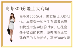 高考才300多分,确实是让人很担忧,毕竟有一些学生在填报志愿和挑选专业学校的时候,往往会处于被动的状态,没办法真正实现自己的大学梦想。高考300分能上大专吗,高考300多分也可以考上大专院校,因为大专院校的分数线一般都不太高,只要可以在学校遵守纪律,听老师的讲课,和其他同学相处融洽,大专院校都非常欢迎同学的到来。技术学院的排名有良好的作用,有些技术学院的排名靠前,说明综合实力较强,有很完整的辅导方案,同学的进步效果更好。职业学院的师资相当优越,不少职业技术学院的老师已经工作多年,了解同学在专业发展过程中遇到的难题,也会针对同学面临的困境,进行针对性的指导,同学掌握这些技术之后,职业竞争力和操作水平会变得更强。