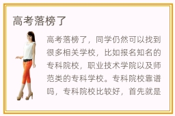 高考落榜了,同学仍然可以找到很多相关学校,比如报名知名的专科院校,职业技术学院以及师范类的专科学校。专科院校靠谱吗,专科院校比较好,首先就是技术要求很严谨,有很完善的教学规划,结合企业应用以及行业动态,安排技术课程。高职院校报名多少钱,高等职业技术学校的报名费用可能是2000~9600,但这些费用有很大的变化,主要就是同学报名的专业以及学校类型不同,费用会有差别。不过综合来看,学费并不算高,很多同学都能够接受。在选择高职院校的时候,许多同学会担心自己没有特别高的学历,很难在社会上立足。事实上专科院校会帮助同学找到很好的工作,也可以与其他本科同学在同一条起跑线上。大家不用灰心或忧虑,应该多多巩固知识,减少学习障碍。