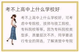 考不上高中上什么学校好,可考虑中专院校,技师与技工院校,专科院校等等。因为专科院校类型多,质量层次不齐,同学要进行专业的筛选,了解清楚中专院校排行榜,根据个人需要以及分数情况做决定。专科学校招生对象很广泛,比如许多落榜的高中生以及初中生,都可以尝试报名专科院校,专科院校往往会敞开大门。部分学校的学历比较低,并没有本科院校的学历高,往往会使学生在工作上会处于劣势状态。同时要有良好的自我定位,挖掘自身优势和潜力,提升专业成绩和工作能力,才能拥有更多进步。有些同学感觉个人的学历很低,学习能力也很糟糕,所以在工作上没有信心。其实大家只要在专科院校,找到自己感兴趣的专业,然后进行不断的强化和突破,认真做好准备,工作优势会很突出。