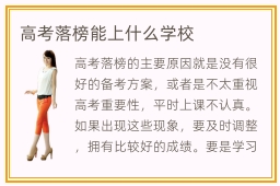 高考落榜的主要原因就是没有很好的备考方案,或者是不太重视高考重要性,平时上课不认真。如果出现这些现象,要及时调整,拥有比较好的成绩。要是学习总是不太上心,可以报考补习班,得到1对1指导,快速调整自己的状态。考试成绩不理想,可以看看高考落榜能上什么学校,比如民办学校,出国留学或者是高职院校,独立学院,职业培训学院等等。专科院校好吗,专科院校的教学能力很强,对很多高考只有100分到400分左右的同学,可以考虑这些院校。专职类院校的门槛并不会很高,教学的水平真的不错,实践能力更强。很多同学报名这些专职院校之后,掌握很多学习技能,胜任各种岗位,即便在学校,也能接触很多应用类的知识,从而强化自己的就业优势和专业水准。