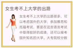 女生考不上大学的出路很多,可以考虑国外的大学,参加雅思和托福考试,要是在这些语言考试中取得较好的成绩,还可以报考国外知名的大学。大专院校分数线不算很高,许多学生考试才200~400分,可以选择大专院校。高等专科学校有用吗,高等专科院校的作用显著,首先是培养许多专科人才,虽然只有三年的时间,但足以让学生掌握一门傍身技能,在工作上有良好的发挥。另外,高等专科院校可以增强学生的学历,在激烈的社会竞争中,不至于马上被淘汰。在学习的时候,可能会面临很多障碍,比如学习进度慢或者是理解不够多,专业水平不高等情况。大家也不要过于气馁,可多了解行业的动态以及发展,针对行业的需求以及技术要求,学习一些重点课程,得到更好的进步。