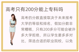 高考的分数直接取决于未来报考大学的等级和排名,假如分数非常糟糕,只有200多分可能会被许多大学拒绝,所以学生要多多对比,筛选合适的职业院校,以免无书可读。高考只有200分能上专科吗,高考200多分的同学也可以报名专科院校,很多专科院校的分数线都不算高,同学只要认真准备,做好相关的调查,了解院校的口碑以及专科高职学校的指导方法,应该可以找到较好的学校。高职院校的学生就业难吗,高职院校的学生就业难度取决于个人能力,假如个人很努力准备,花大量时间学习专业技能,在毕业后就能够马上投入到工作中,不用另外培训,就业的优势会显著很多。当然不管挑选哪一些职业学院,都应该学习前沿的知识,掌握重要的工作技能,不要满足于当下的课程。