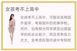 女孩考不上高中,可能会选择国外留学,考取国外的名牌学校。另外,也有部分同学感觉出国留学的机会比较少,而且竞争压力太大,会考虑在国内读中专院校、技工学院等。事实上,很多工作的要求都需要达到大专以上的学历,要是同学只是中专的学历,确实很难有优势。因此如果有条件的话,还是可以就读普通高中,或者是重新考一年,然后得到高考机会,想方设法提高成绩,获得大学录取通知书。中专院校哪些专业好,中专院校很多专业都十分热门,包括计算机人工智能,软件开发,电子信息,建筑专业,设计专业等等。而且专业水准高,培训力度强,同学也很满意。高等专科学校受不受企业认可,高等专科院校是受企业认可的,但在工作上可能会有一点机会,所以学生要多多强化技术能力。