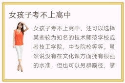 女孩子考不上高中,还可以选择某些较为知名的技术师范学校或者技工学院,中专院校等等。虽然说没有在文化课方面拥有很强的水准,但也可以另辟蹊径,掌握一门技术,找到适合的发展舞台。中专院校是全日制吗,中专院校往往是全日制,同学需要在这些院校学习三年的时间。另外,中专院校一般采用严格的管理模式,全程封闭化管理,所以同学不用担心学风问题。高等专科学校学历高吗,高等专科院校的学历并不算高,只是达到普通工作的基本实力要求而已。如果不太满意自己的学历,可以考虑成人本科,参加一次高考得到上大学的机会。专科院校的学习过程中,还要尝试许多应用的内容,因为在工作中,考验的不仅仅是学生的实力,还要求专业人员拥有非常成熟的应用能力。