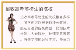 招收高考落榜生的院校相当多样,同学也可以根据各种分数线,挑选合适的院校类型,比如技术学院,大专院校,技师学院等等。有些学校的经验丰富,师资力量很强,课程安排严谨,专业水平高,同学也从中得到很多收获。技师学院一般招哪些学生,一般会欢迎高考或中考成绩不太理想的同学。如果高中生落榜,没有考上本科线,可结合个人的成绩,找到某些专科院校。大专学校的优点主要在于开展很多专业类型和课程,同学只要对某些学科有兴趣,也想要深入进行研究,都可以报名这些专业学院的课程。不过大专院校也是有缺点的,因为国内的高等教育扩招已经进行多年,许多学生都有本科学历,专科学生在工作竞争方面可能不如其他同学,只能从事一些基础性岗位,因此大家要做好应对准备。