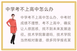 中学考不上高中怎么办,中考时成绩不理想,考不上高中,确实让人很困惑,找不到未来发展途径。技术学院靠谱吗,技术学院当然相对靠谱,很多同学报名某一些技术院校后,可以改善学习能力,优化知识结构,提升学习信心,也能掌握某些技能,对个人应聘或者是就业过程都有好的帮助。中专院校的要求比较高,比如同学报名中专院校后,应该听从老师安排,完成各项课程。同学还要努力开拓学习方向,掌握专业的知识,改善学习成绩。其实面对各种复杂的技术知识,同学可能会缺乏信心,或者是动力不够充足。技术学院的辅导老师很了解同学面临的困惑,然后安排基础性的课程,使大家积累更多技术经验。不过要想获得进步,不仅要得到老师的教学,自己也要多整理知识结构。